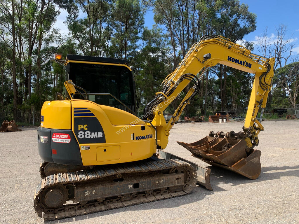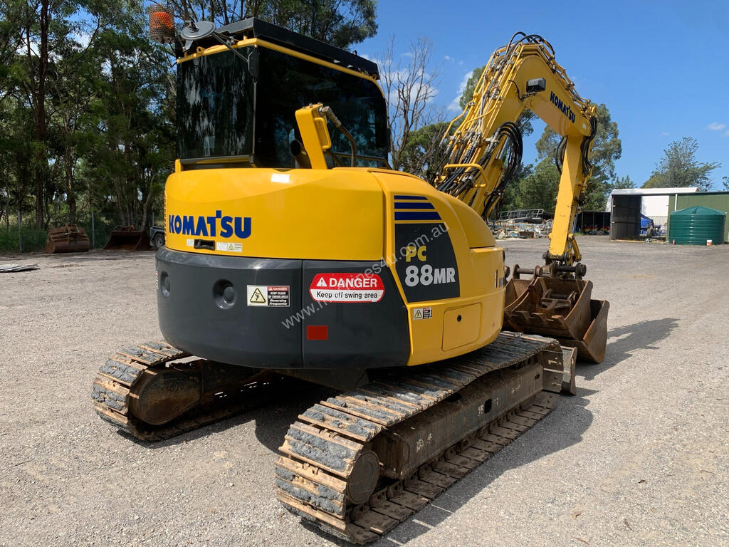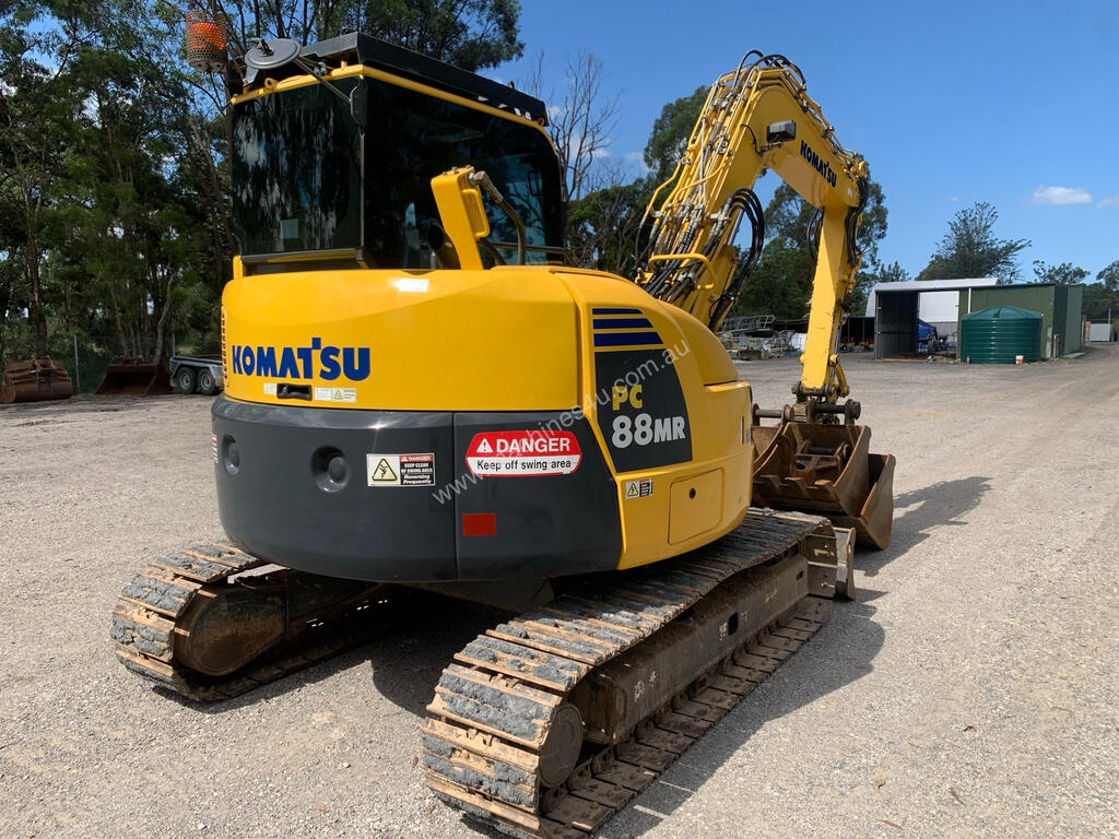 Description: KOMATSU PC88MR-8 zero swing excavator. ROPS FOPS air conditioned cabin. 2014 model with 7,485 hours. Fitted with blade, swing boom, hammer piping, Hydraulic burst valves, JB double locking Powertilt Hitch, 4 buckets and 1 ripper, new set of track chains . PRICE = $ 66,500 + GST